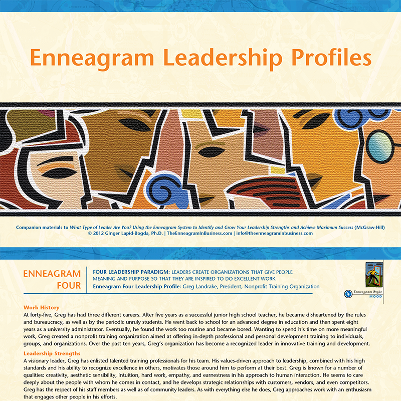 A 23-page workbook of nine case studies of excellent leaders, one of each Enneagram type, serve as a mirror for leaders to see themselves in action and become their own leadership coaches.