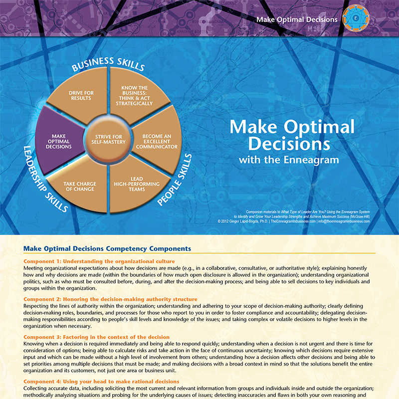 Assess your ability to Make Optimal Decisions, learn the productive and unproductive uses of the Head, Heart, and Gut, and engage in three development activities to enhance your decision-making capability.