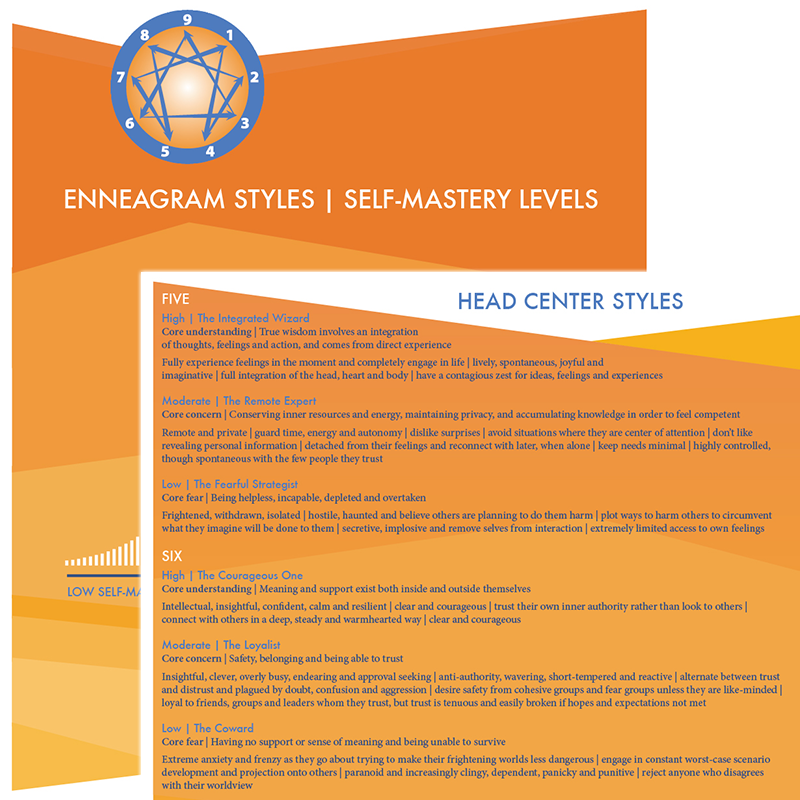 Understand each of the 9 Enneagram types at low, medium, and high levels of self-mastery. Includes a full color insert that displays and explains the self-mastery model on multiple dimensions – from self-awareness to receptive to feedback to self-responsible, self-managing, and more.