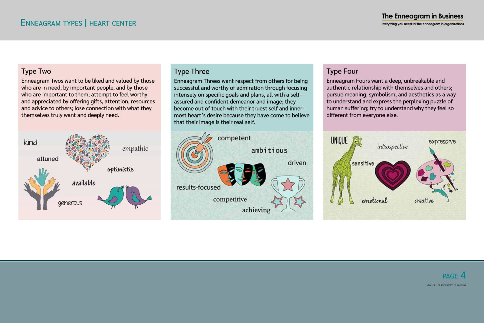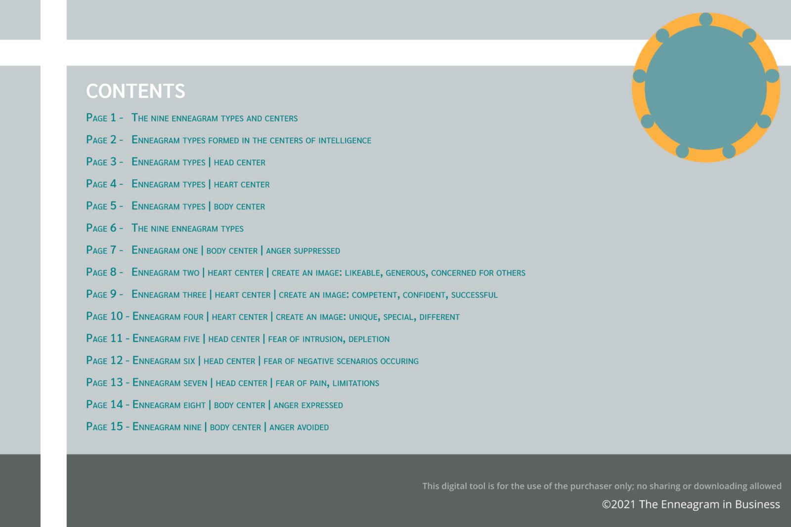 Learn about the 9 Enneagram types in this 15-page virtual tool that includes visual and written descriptions of the 9 Enneagram types, all in the context of the 3 Centers of Intelligence. This virtual tool can be used online and is ideal for self-learning or for use in online teaching instead of power points. If participants want their own copy of this tool, they must purchase this item themselves. A User Guide will be immediately provided for download after purchase.