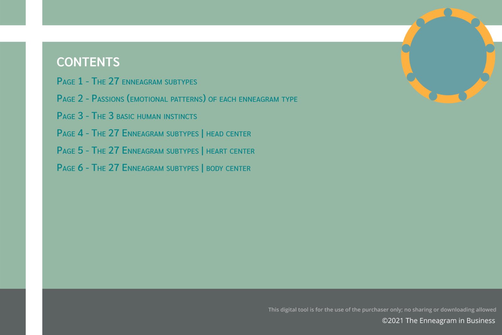 Learn about the 27 subtypes in this 6-page virtual tool that includes the passions of each Enneagram type, the three basic human instincts, and precise descriptions of each of the 27 subtypes. This virtual tool can be used online and is ideal for self-learning or for use in online teaching instead of power points. If participants want their own copy of this tool, they must purchase this item themselves. A User Guide will be immediately provided for download after purchase.